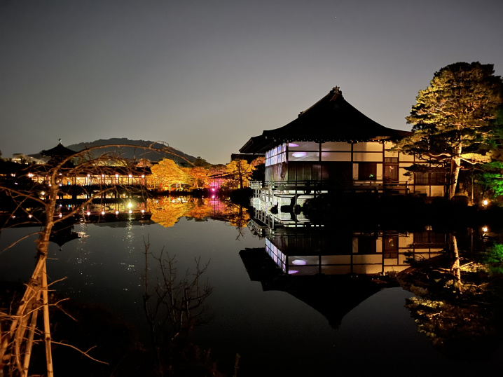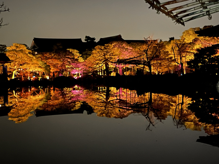 池があって、池に写った木や建物のライトアップが幻想的な雰囲気を醸し出しています